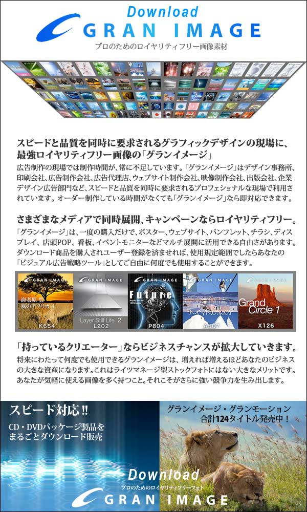 広告制作の現場でガンガン使える!!ロイヤリティフリー素材集の「グランイメージ」。好評のCD・DVDパッケージ製品をまるごとダウンロード。アマゾンダウンロードのスピードでビジネスチャンスの拡大、コストダウン要求や広告戦略の変更に即対応します!「グランイメージ」は一度の購入だけで、ポスター、ウェブサイト、テレビ、パンフレット、チラシ、ディスプレイ、店頭POP、看板、デジタルサイネージ、スマートフォンなどで活用できるロイヤリティフリー素材集です。広告制作会社、デザイン事務所、印刷会社、出版制作会社など、スピードと品質を同時に要求される広告のプロの制作現場で「デザイン戦略ツール」として利用されています。