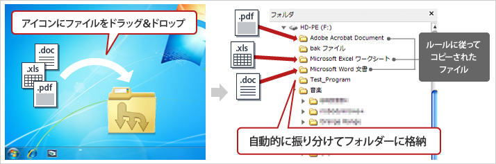 本製品に付属のソフトウェア※1「Easy File Sort(イージーファイルソート)」を使えば、デスクトップ上にあるアイコンへファイルをドラック&ドロップするだけで、あらかじめ設定した条件に合わせてファイルを自動的にフォルダーへ振り分けて整理できます。そのため後のファイル管理や検索が簡単に行えます。