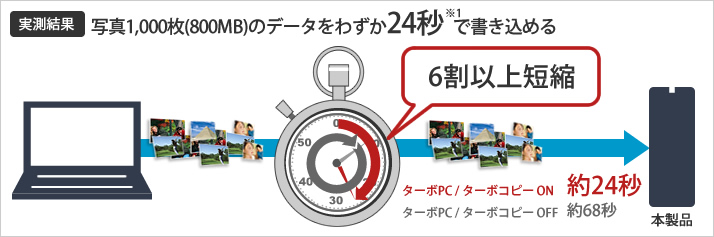 <測定方法> HDDをPCのUSB2.0ポートに接続。PCのHDD内に保存した800KBのファイル1,000個をHDDにコピー。コピー開始からコピーダイヤログが閉じるまでに要した時間を高速化ソフトウェア、ターボPCとターボコピーのON/OFFで計測。