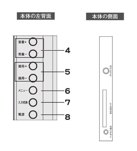 - 入力&出力:アンテナ入力、コンポジットビデオ入力、HDMI入力 D5映像入力、PC入力、B-CAS