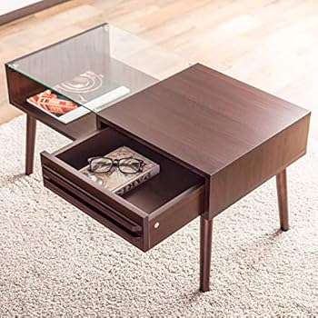 【オシャレな生活デザイン】魅せる・収納するセンターテーブル(80×43cm)木目と透明ガラスの組み合わせ 引出しまでオシャレなディスプレイテーブル 両側に引き出せる収納 脚裏傷防止フェルト付 Bタイプ ダークブラウン