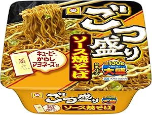 ごつ盛りソース焼そばは、麺のボリューム(130g)と美味しさ(こだわりソース+マヨネーズ付)によって、手軽(低価格)に味わう事が出来る大盛カップ焼そばです。麺は、香味豊かな、滑らかで弾力のある丸刃で切った麺を使用しています。麺重量130g、3分戻しの麺です。ソースは、ウスターソース、中濃ソースにどろソースにを加えたオリジナルのスパイシーな焼そばソースに、別添のからしマヨネーズでまろやかに仕上がります。かやくにキャベツを使用しています。