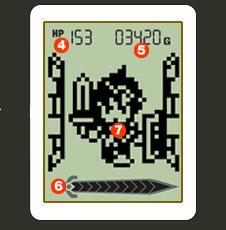 ![]() | (4)ヒットポイント 主人公の体力(ヒットポイント)を表示 (5)貯金額/フロア表示 貯金した金額や現在のフロアを表示 ゲージ バトル中のモンスターの体力や次のフロアまでの進行度などを見ることができるぞ (7)主人公 装備を変えると主人公の見た目が変化! |