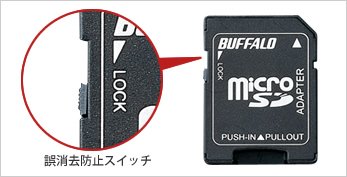本製品付属の変換アダプターの左側面についている「誤消去防止スイッチ」を“Lock”に切り替えることで、内部のデータの変更ができなくなる。データを削除したり上書き保存ができないようになるので、大切なデータが入っている場合に便利。