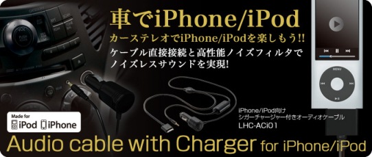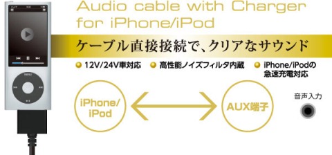 カーステレオのオーディオ入力端子(AUX端子)に接続して、iPhone/iPodの音楽を車で楽しめるiPhone/iPod専用のチャージャー付きオーディオケーブルです。