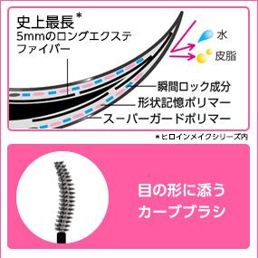 新成分のスーパーガードポリマーを配合!独自の耐久処方でにじみにくさが一層パワーUP! 涙・汗・水をはじき、皮脂にもにじまない成分です。まつ毛をきれいにコートして、にじみや繊維落ちを防ぎます。 ※ヒロインメイクシリーズ内