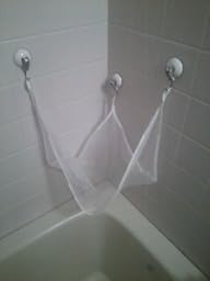 お風呂場で散らかりやすいおもちゃや小物を収納するためのハンモック型のネットです。