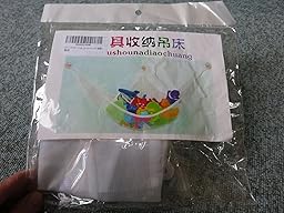 しわしわの袋に、表のラベルは、いかにもプリンターで印刷した荒い画像(HPから印刷したような画像)の上に中国語の「玩具収納吊床」の文字。