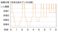 ※右の表は一般的な睡眠パターンです。表が示すように、一晩の睡眠サイクルの中で何度かほぼ目覚めているような状態が起こります。睡眠の終わりに向かうにつれ、浅いステージでの睡眠へと変化していきます。
