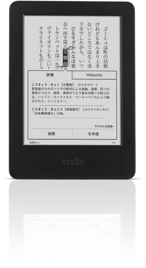 Kindleの検索機能ではタップするだけで辞書とウィキペディアを検索できるので、言葉の意味や詳細などをページから離れることなく調べることができます。